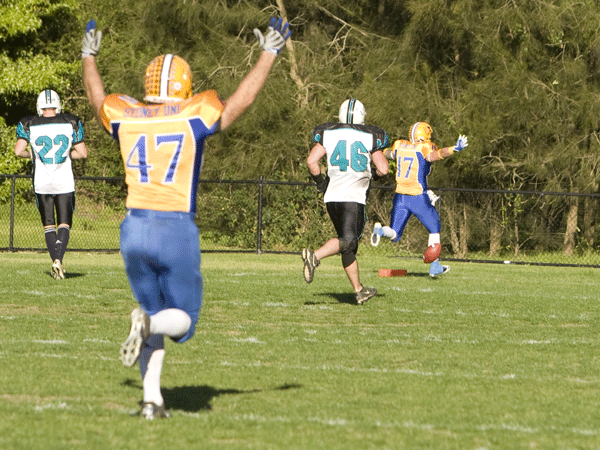 The Lions defence set up the next score after safety Anthony Sinton picked off a pass from the Gators’ quarterback and returned it to the 18 yard line.  The Lions needed a 4th down keep from quarterback Kiernan Dorney to get the touchdown and a 14-0 lead.